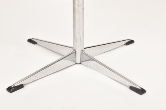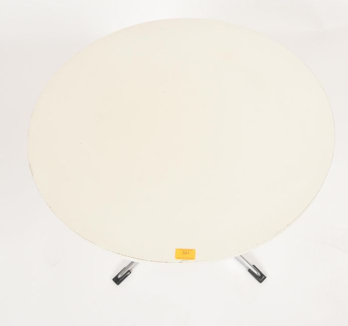 A retro mid 20th century white & chrome Formica side occasional low coffee table. The table having a white circular top over a central chrome column on four arms supports. Measures approx. 51cm tall x 71cm in diameter.