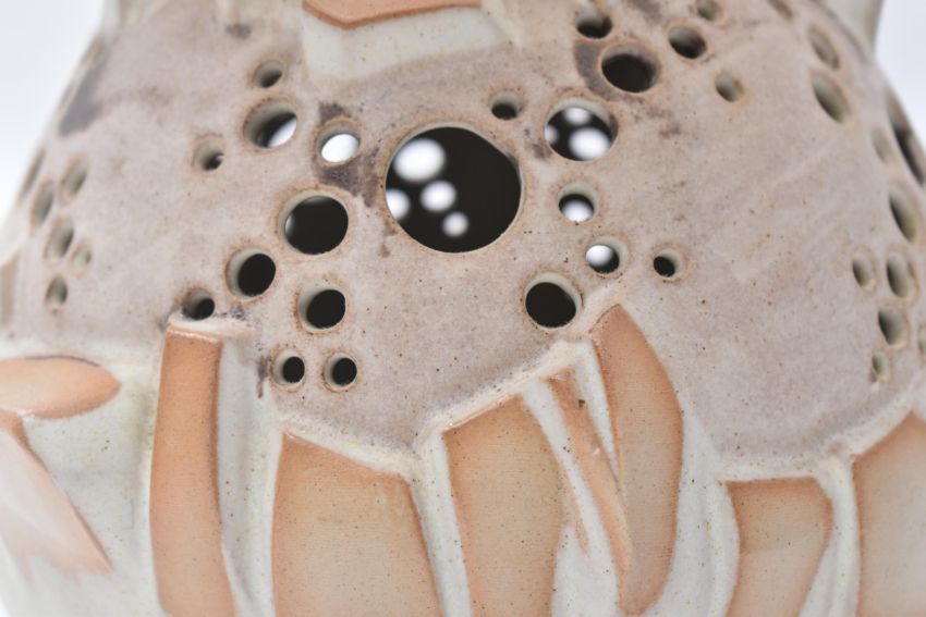 Shelf Pottery - A vintage 1970s studio art pottery table lamp light. The lamp having a free form base with pierced detailing and abstract patterns. Marks label to the side. Sold as untested. Measures approx. 51cm x 25cm diameter.