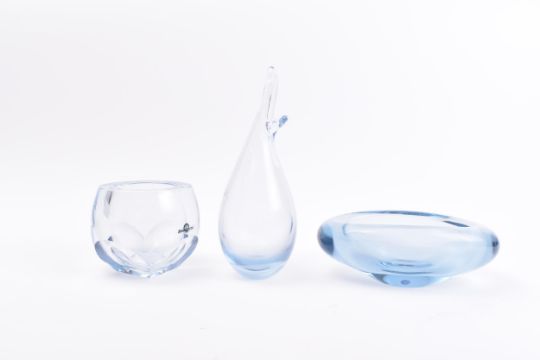A collection of three mid 20th century vintage Swedish transparent studio art glass centrepieces / vases. The lot to comprise two pieces by Per Lutken for Holemgaard, being a duck bill vase, an oval shaped soap dish in aqua blue, and a Strombergshyttan faceted centrepiece marked 31184 to base. Each signed to base. Tallest to measure approx. 25cm tall.
