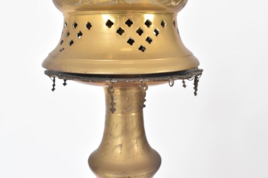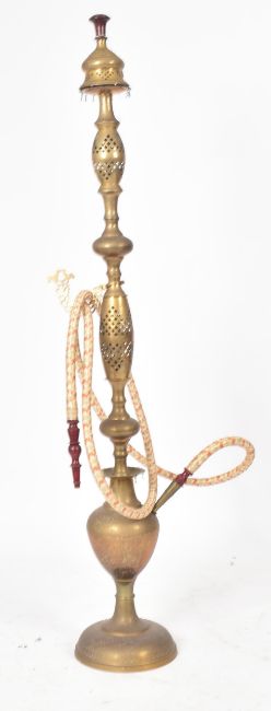A large vintage 20th century Middle Eastern brass hookah pipe. The pipe having pierced patterns to the single shaped stem with all raised upon a circular base. Measures approx. 150cm x 25cm diameter.