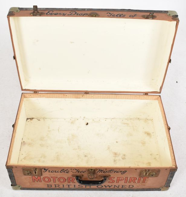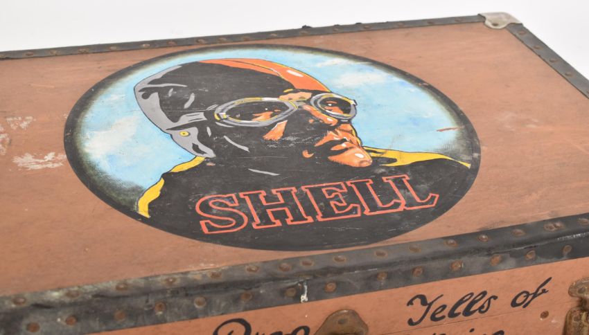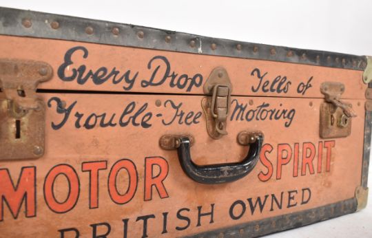 A vintage 20th century leather bound steamer trunk / travel case. Black leather and brass bound with the hinged top opening to reveal a hollow interior. Latter painted Shell Motor Oils advertising to the top and front. Measures approx. 30cm x 77cm x 47cm.