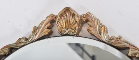 A vintage mid 20th century Italian hall mirror having a gilt scrolled frame interspersed with peach glass panel. The central mirrored panel having a bevelled edge. Measures approx. 114cm x 34cm.