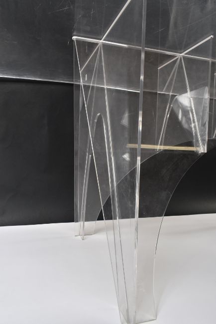 A large Contemporary British Modern Design perspex dining / conservatory table. The table having a rectangular top over shaped decorative slat supports. Measures approx. 72 x 198 x 100cm.