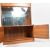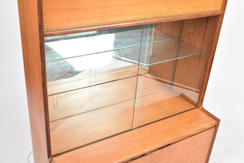 Turnidge of London - A vintage mid 20th century circa 1950s teak & glazed drinks / cocktail cabinet highboard. The cabinet having a tilt down top cupboard space opening to reveal a mirrored interior over twin glazed sling doors. The base having twin door cupboard space opening to reveal a shelving interior. All raised on plinth base. Label to door. Measures approx. 140cm x 91cm x 41cm.