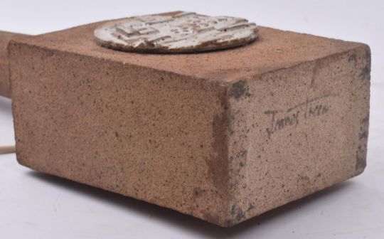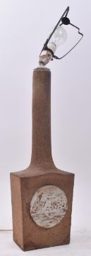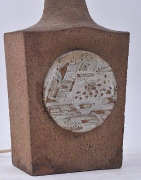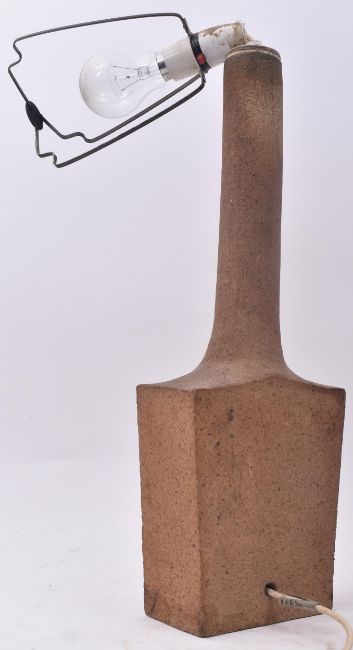 A retro 20th century studio art pottery lamp in the manner of Troika. The lamp having a elongated neck with squared base with abstract decoration the front. Signed to the base. Sold as untested. Measures approx. 75cm x 16cm 9cm.