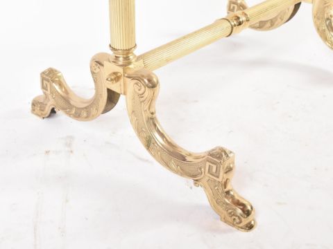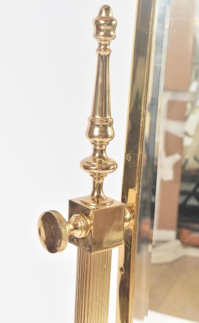A retro vintage 20th Century 1980s Hollywood Regency brass framed adjustable cheval full length dressing mirror having a domed top and tapering bottom with dark green velvet lined back. Reeded column supports with all raised on greek key scrolled feet. Measures approx; 170cm x 65cm x 50cm.