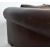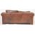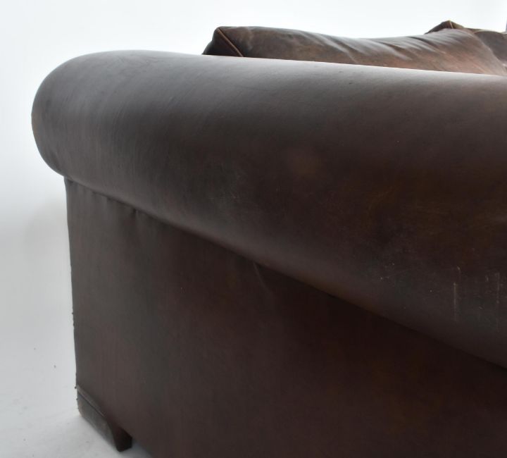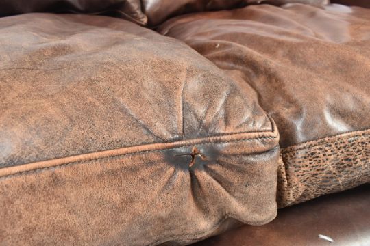 A modern high-end British Design two seater leather sofa. The sofa having scrolled elbow rests raised on bun feet. In brown tan leather. With original cushions. Measures approx. 65cm x 160cm x 100cm