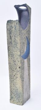 Paul Philp (b. 1941) - Studio Pottery - A tall abstract shaped decorative vase. The vase having a crescent shaped pierced top over an inverted tapered body. In yellow / green colourway with light blue detailing. Measures approx. 40cm x 10cm x 6cm