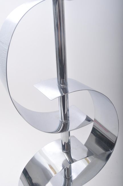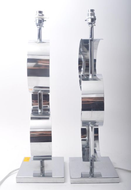 A pair of contemporary high end designer Space Age chrome metal desk table lamps lights. Each lamp a velvet crocodile skin effect grey shades over a central column decorated with three intertwining folded metal plaques. Raised on squared base.