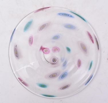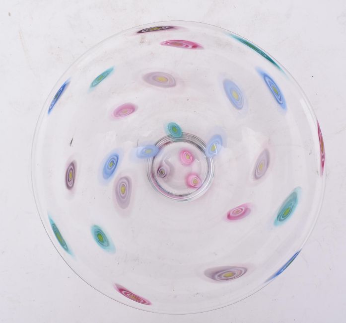 Riihimaki Lasi - a selection of mid century studio art glass to include a ovoid shaped vase in purple. Together with another Riihimaki glass vase in an emerald green colourway. Together with clear and millefiori glass centrepiece bowl. Largest vase measures approx. 26cm.