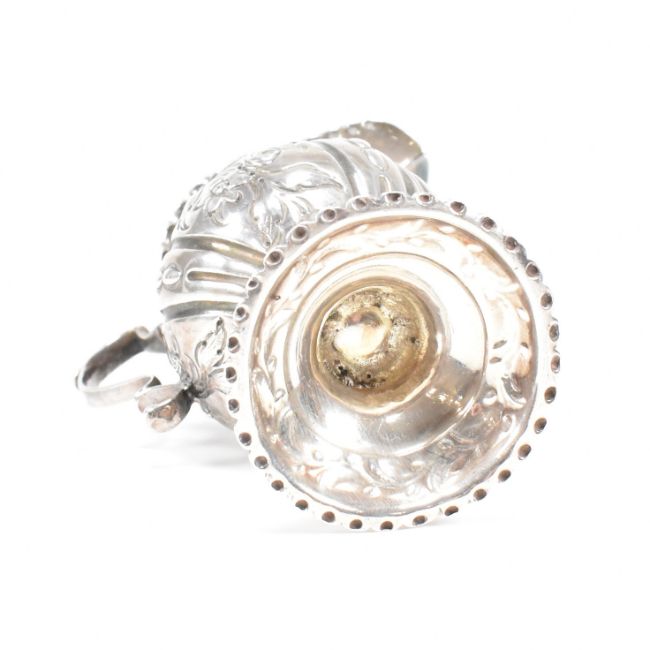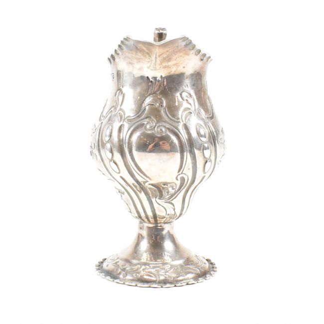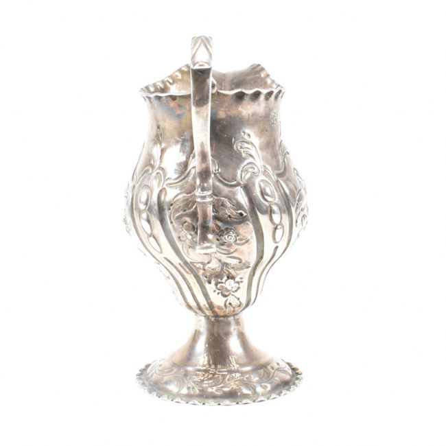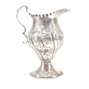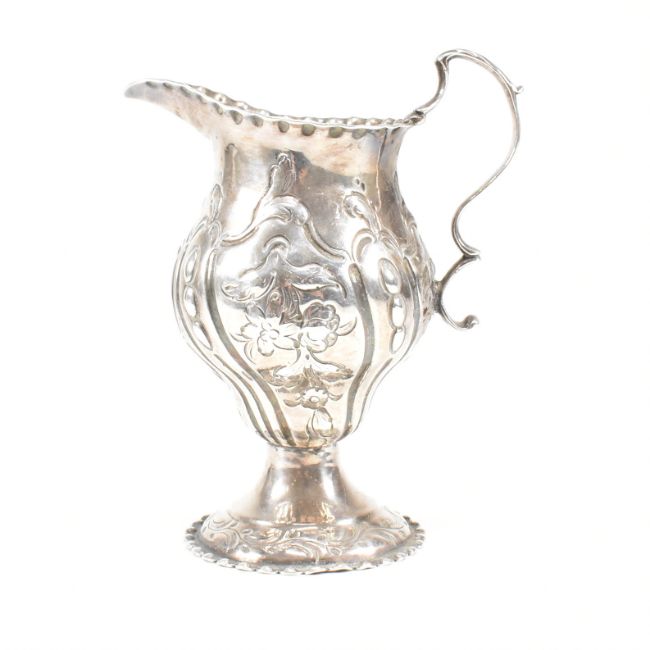 A George III hallmarked silver creamer. The creamer or jug having a circular plinth base rising to a bulbous form decorated with floral and foliate repousse design and having a central vacant cartouche. Hallmarked for London, 1778. Makers mark ASNA for Ann Smith & Nathaniel Appleton. Weight approx 81g.