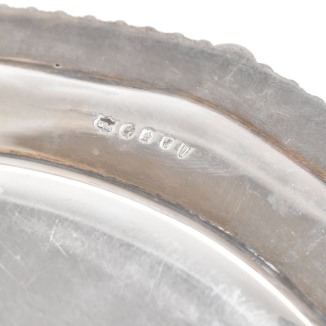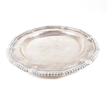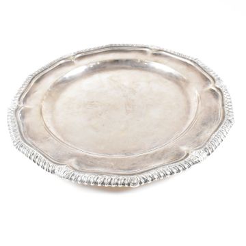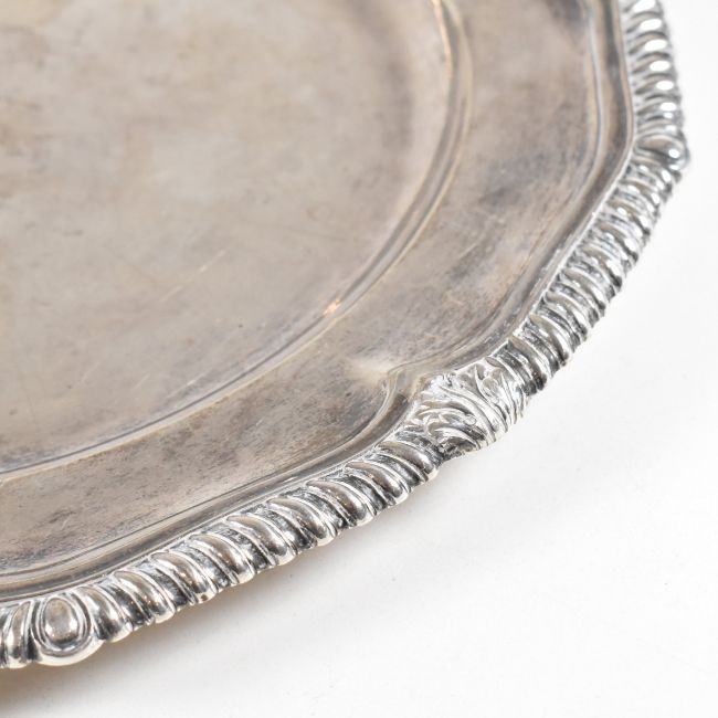 A Victorian Irish hallmarked silver salver. The salver having a stepped rim with serpentine edge, raising to a moulded scrolled rim. Hallmarks partially legible. Possibly Dublin, 1879. Makers mark W&S and marked to verso West & Son Dublin. Weight approx 600g. Measures approx 26cm diameter.