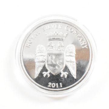 A  one oz 2011 Royal Silver Company coin. The coin being marked .99999 extra fine silver. The coin having the text and image of 'Gato andion andean cat'. Weight including casing approx 37g. Measures approx 4.3cm diameter.