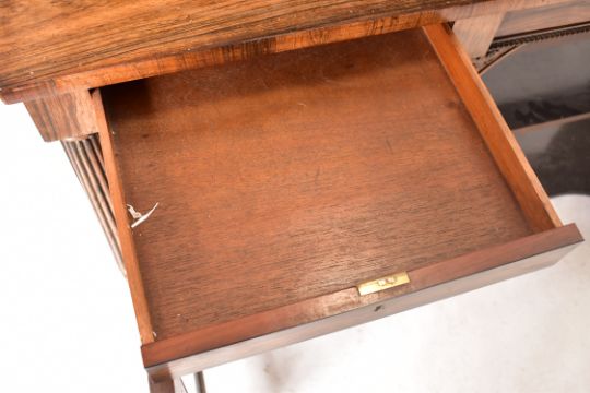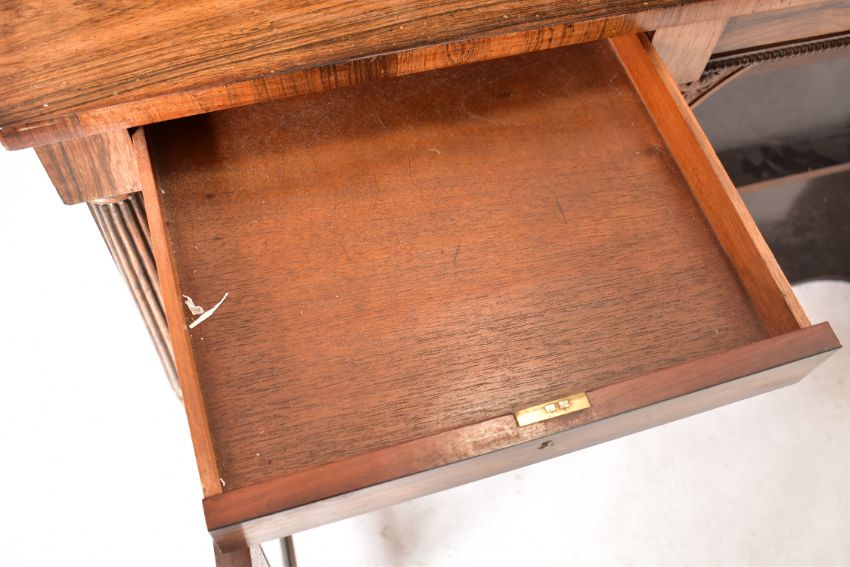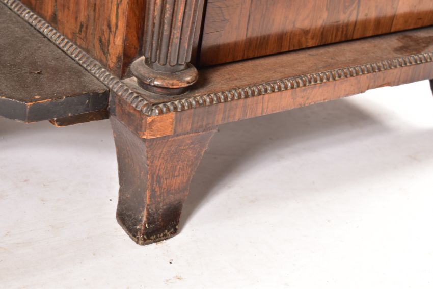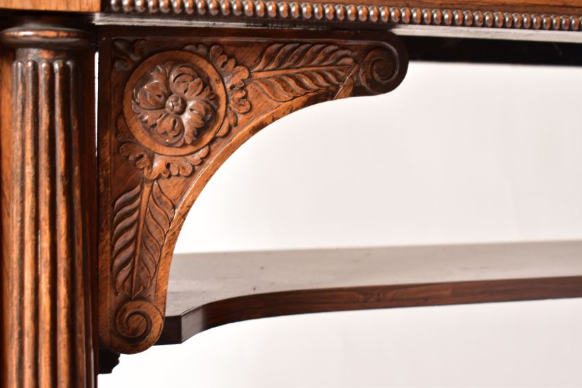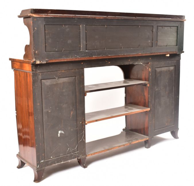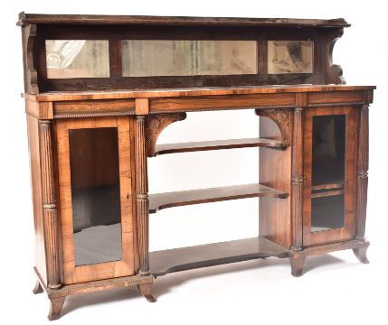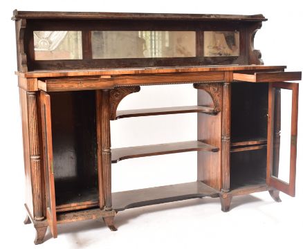 A 19th century rosewood credenza having an open window bookcase with arched top flanked by end glass pier display cabinets. Doric columns to the sides and centre, all raised on shaped supports. Measures approx. 133cm x 173cm x 42cm.