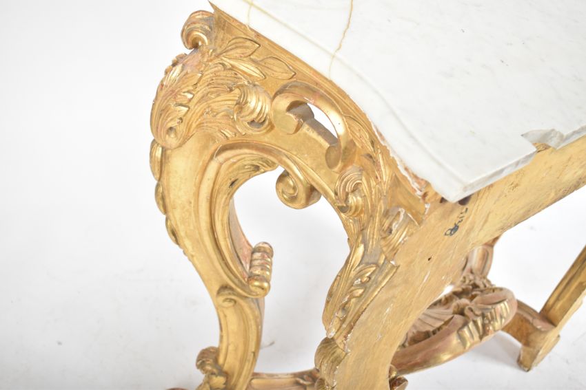 A 19th century Rococo style gilt wood & marble top console hall table. The table having a serpentine stepped white marble top over an intricately floral moulded front with central foliate crest. Raised on cabriole acanthus leaves legs. Measures approx. 100cm x 110cm x 51cm.