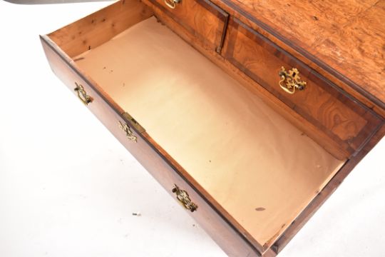 An 18th century Queen Anne pollard oak crossbanded chest of drawers. Raised on bracket feet with short and deep drawer configuration. Brass handles to the drawers. Pine lined drawers, the body with pollard oak and crossbanded walnut. Measures approx. 94cm x 91cm x 48cm.