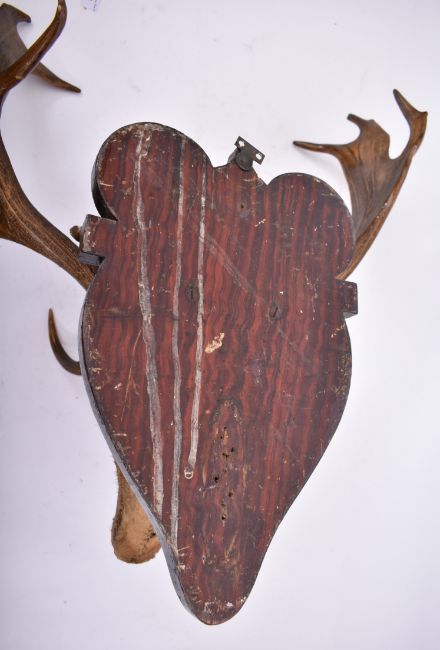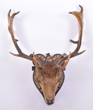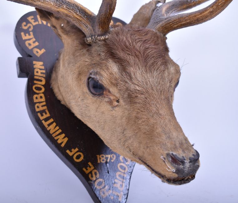 Natural History Interest - a 19th century European fallow deer stag taxidermy head mounted on wooden plaque. The stag with complete grown antlers. The mount reading ' Presented by the Marquis  of Worcester, to Court Rose of Winterbourn 1879 '. Measures approx. 70 x 60cm.