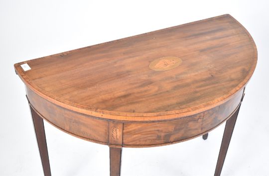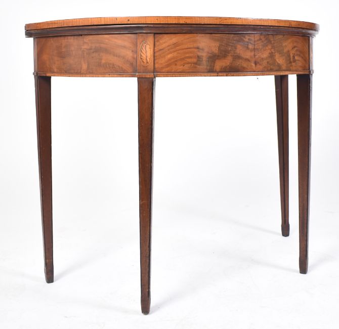 An 18th century Inlaid mahogany George III mahogany games / card table. Raised on tapering legs with spade feet having half moon / demi - lune frieze  and fold over games table top with baize lining. Conch shell inlaid detailing with cross-banded borders. Measures approx. 73 x 92 x 91cm when open.