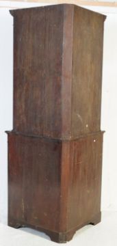 A Victorian 19th century mahogany corner cabinet / cupboard. Raised on bracket feet with cupboard to the base. Above, an astragal glazed door cabinet with shelved interior. Flared pediment atop. Measures approx. 212cm x 102cm x 73cm.