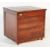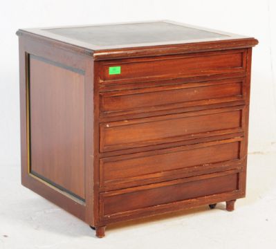 A retro vintage 20th Century mahogany and leather desk top office filing chest of drawers. Having a bank of five drawers with inset leather work top, raised on ball feet. Measures approx; 60x60x50cm