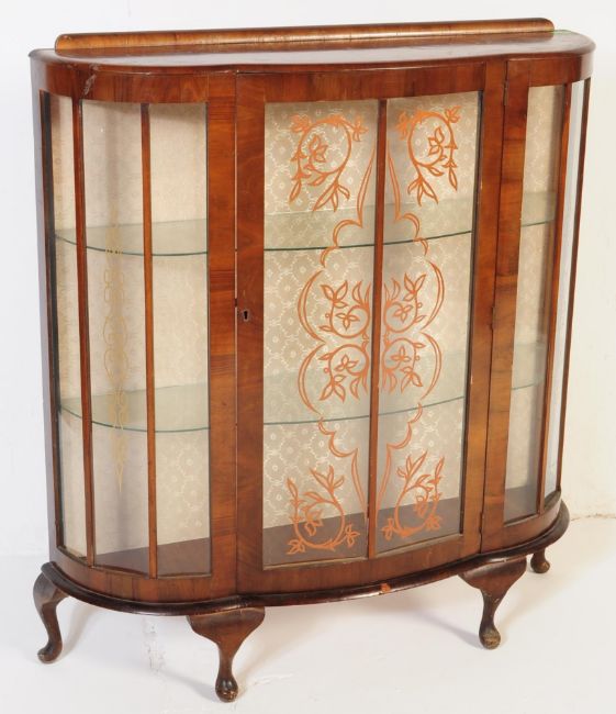 1950's  post war Queen Anne revival walnut demi lune China display cabinet. Raised on cabriole legs with shaped upright glass body having central door with glass shelves withinMeasures approx: 112x101x30cm