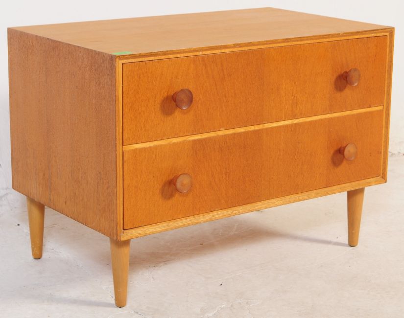 Meredew - A retro mid 20th century light oak Meredew low chest of drawers. The chest of drawers having a bank of twin drawers each with circular conical handles raised over tapering supports. Measures approx: 55x76x46cm