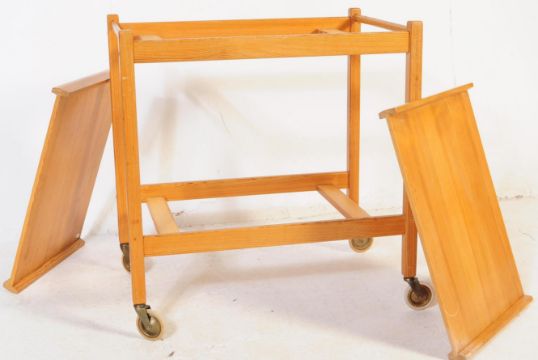 A vintage 20th century teak wood butlers serving tray / trolley. Rectangular form with removeable trays, supported on square upright legs terminating in castors. Measures approx. 70x70x56cm