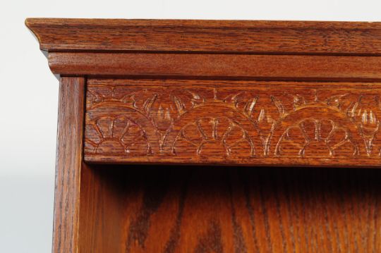 A 20th century oak veneer open bookcase. The bookcase having pediment top over frieze carved with floral decoration over a series of five shelves, all being raised over squared feet. Measures approximately 82cm x 32cm x 183cm tall