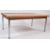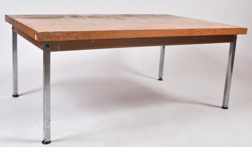 A retro 20th century oak and chrome coffee table / low in the manner of Merrow Associates. The table having a oak rectangular top supported by straight leg chrome supports. Measures approx. 50cm x 122cm x 77cm.