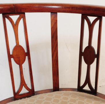A pair of Edwardian circa 1900s mahogany bow back tub chairs. The chairs having bowed top rail over open pierced splat back raised over a a circular seat upholstered with cream fabric and braid upon tapering supports. Measures approx: 70x50x40cm