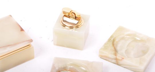 A vintage 20th century Azizoff of London genuine onyx marble table top smoking set. Comprising of a pair of ashtrays, and cigar / cigarette box chest holder with a table top lighter. In polystyrene case. Measures 13.5 long.