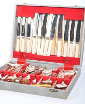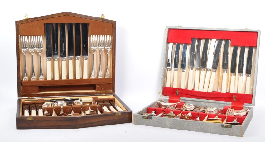 Two vintage 20th century canteens of cutlery. Sheffield silver plate cutlery and Wostenholm & Son stainless cutlery. Including, table knives, dessert knives, table forks, dessert forks, teaspoons, dessert spoons and soup spoons. Both housed in a wooden case.