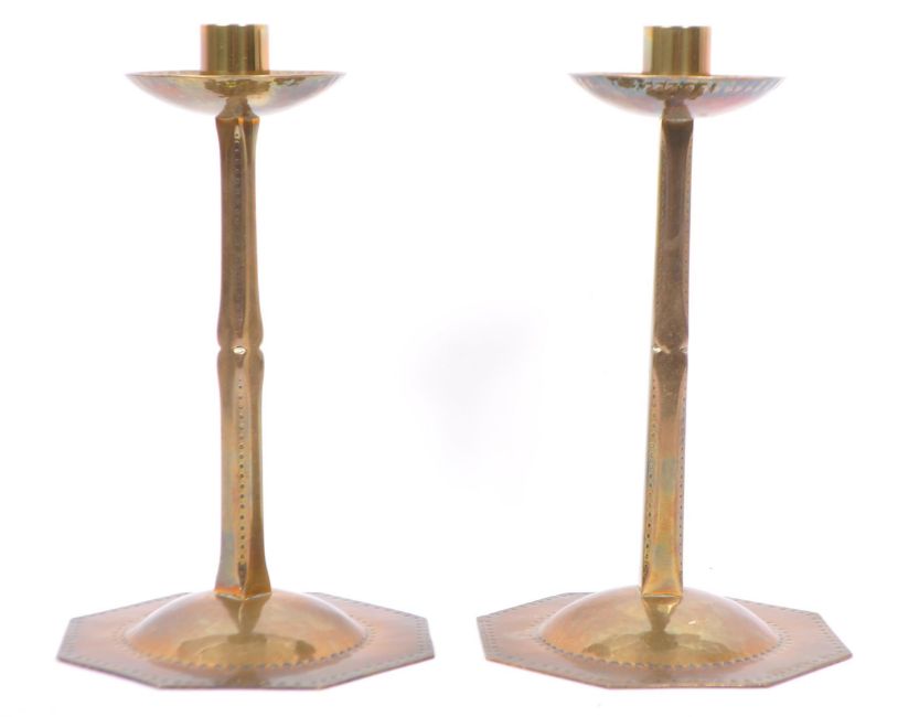 A pair of mid 20th century brass candle stick holders, having a shaped and perforated central column with a hexagonal pierced star design base. Measures 25cm (height).