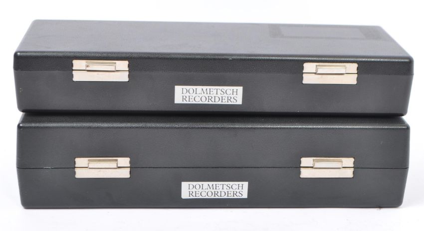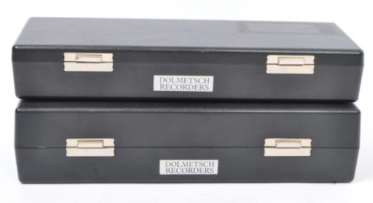 Musical Instruments:  2 Dolmetsch recorders. Each cased in travel cases of black plastic construction. The recorders of wooden construction