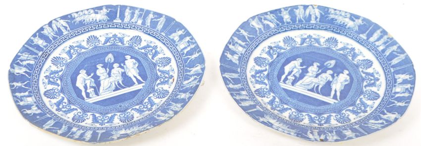 A pair of early nineteenth century blue and white transfer-printed Minton Kirk Greek series dinner plates. The plates unmarked to verso. Measures 25cm