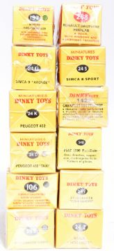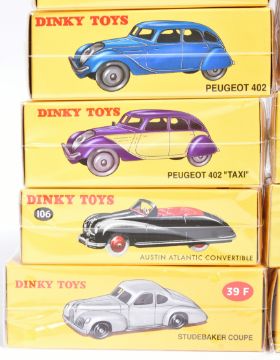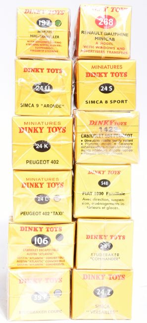 Diecast - a collection of x12 Atlas Edition reissue Dinky Toys diecast model cars to include; 24U Simca 9 Aronde.197 Morris Mini Traveller, 24L Peugeot 402 Taxi and others. All models factory sealed.