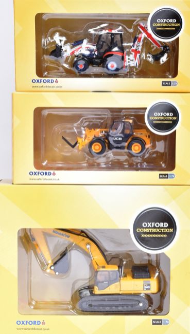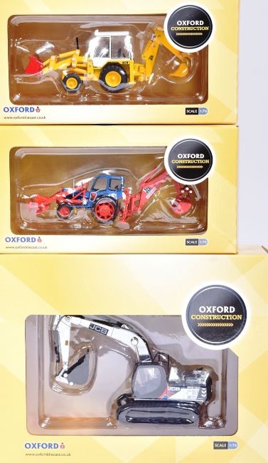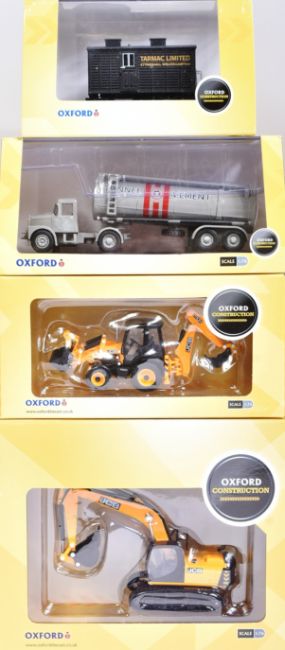 Diecast - a collection of x10 Oxford made 1/76 scale diecast Construction vehicles to include; JCB Backhoe Loader, Scammell Highwayman Tanker Tunnel Cement, JCB Tracked Excavator and others. Models appearing mint. Boxed.
