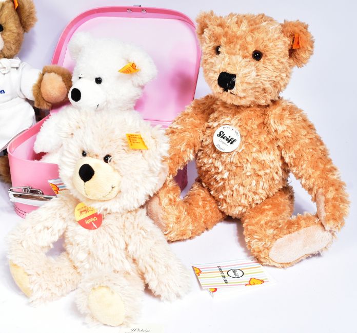 Teddy Bears - a collection of x7 original German Steiff made soft toy teddy bears comprising; 111563 Lotte bear in suitcase, 012938 Charly dangling bear in suitcase, 109935 Buddy, 014253 Paddy, 022456 Elmar, 012815 Charly and 993251 Hilton Chef teddy bear. All with tags to the ear and original labels attached. Largest measures approx 33cm.