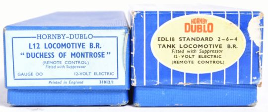 Model Railway - two vintage Hornby Dublo OO gauge trainset locomotive engines, comprising of EDL18 standard 2-6-4 tank locomotive B.R. and an L12 'Duchess of Montrose' B.R. locomotive, both housed within their original boxes.