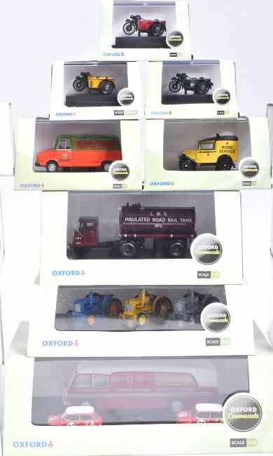 Diecast - a collection of assorted Oxford made 1/76 scale diecast Commercial vehicles to include; Thompson Refueller Silver City, Scammell Mechanical Horse Van Trailer, BSA Motorcycle and sidecar Royal Mail and others. Contents appearing mint. Boxed.