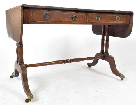 A 19th century George III mahogany sofa table desk. Raised on turned and splayed legs with brass cap castors having twin drawers to the frieze, the top with drop leaves either end. Measures approx.71cm x 110cm x 66cm.