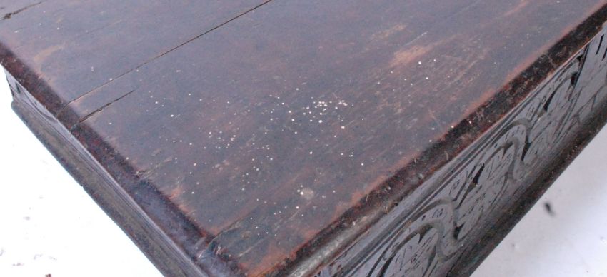 A 17th century oak carved bible box. Of rectangular proportions, the hinged lid opening to reveal a spacious interior. A square wrought iron lock central, with repeated pattern carvings to front panel. Measures approx. 20cm x 82cm x 47cm.