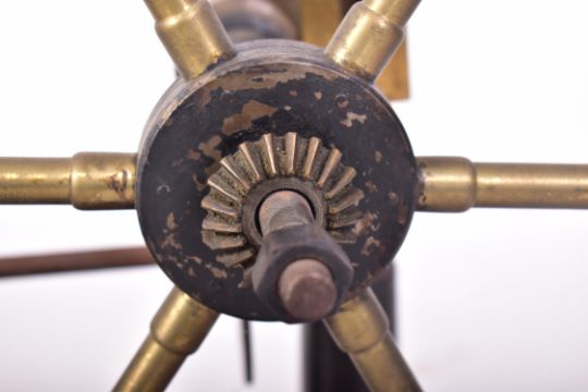 A 19th Century Victorian brass wool winder. The moulded edge mahogany plinth raised on turned legs, the brass wheel mounted upon the base. Measures approx. 64cm x 87cm x 40cm.