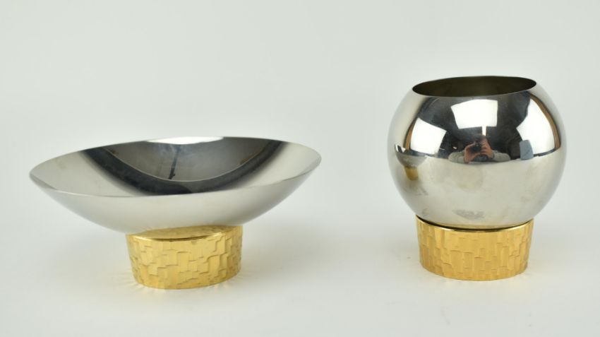 Stuart Devlin for Viners Sheffield - two vintage 20th century stainless steel bowls. One a wide trinket dish bowl, the other a tealight holder. Each on fixed gilt mount. Marked to base. Bowl to measure approx. 13cm in diameter.