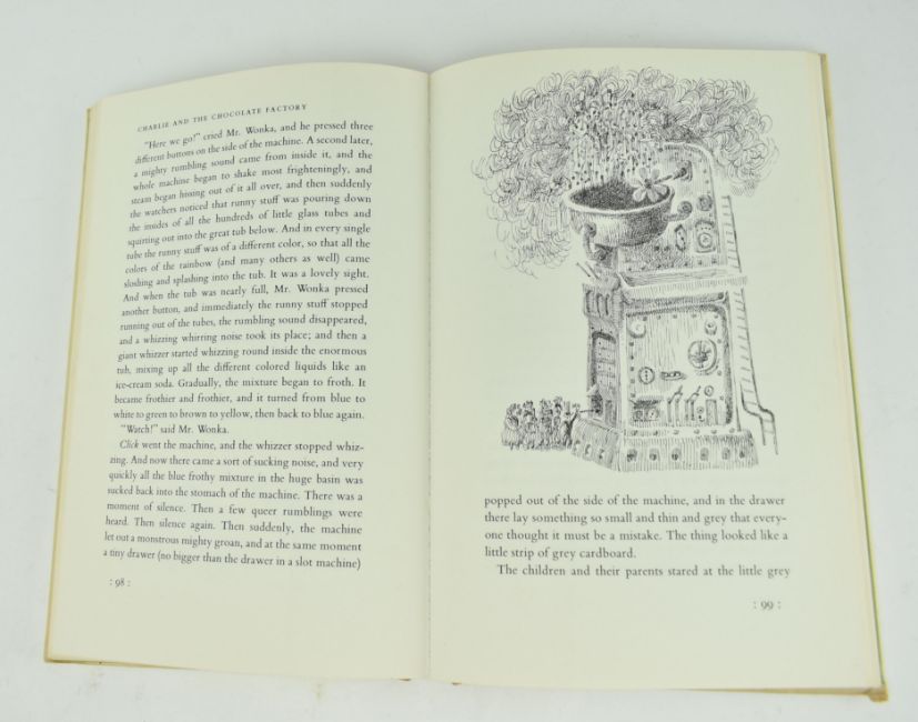 1964 Charlie and the Chocolate Factory - Roald Dahl, illustrated by Joseph Schindelman. Published Alfred A. Knopf. Presented in unclipped dust wrapper priced at $3.95. Prior owner's inscription to the front pastedown. An early U.S. edition of one of Dahl's more enduring stories, popularised by adaptations starring Gene Wilder & Johnny Depp as Willy Wonka. Measures approx. 24cm x 16cm.