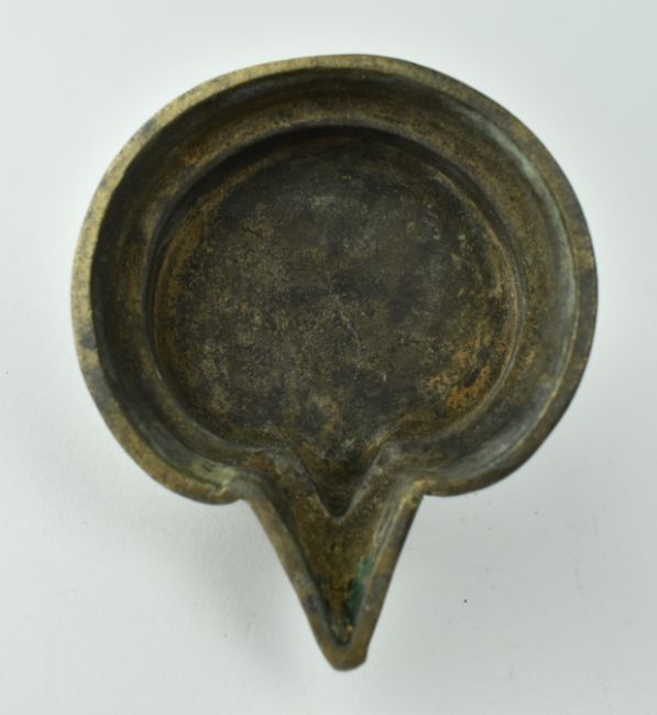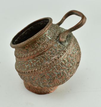 A collection of three pieces of 19th century & later hammered metalware. The lot comprising a North African dallah coffee pot, a small Moroccan copper salt cellar with repousse floral decoration, and an Indian brass oil altar lamp with Hindu deity Lakshmi to the back. Coffee pot to measure approx. 30cm tall.