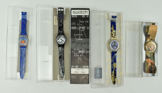 Swatch - a collection of four vintage 1990s and onwards cased Swatch watches. The lot comprising Atlanta 1996 Chrono watch, L'Essor S640 235/1000 in slipcase, Azimut GK179, and Vivienne Westwood designed Pop Swatch Putti PWK168. Sold as untested. Largest case to measure approx. 24.5cm x 6cm.