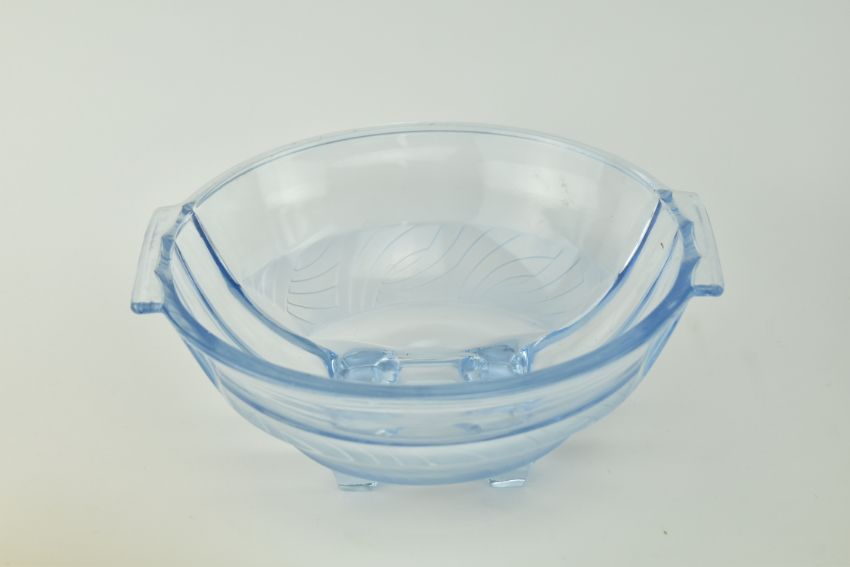 A collection of mid 20th century Art Deco style coloured cut glass centrepieces & bowls. The lot to comprise two transparent Art Deco fruit bowls with moulded & frosted decoration, a green starburst plate, a cut glass butter dish, and a selection of pieces in uranium green, amber and blue. Approx. 11 pieces in lot, largest bowl to measure approx. 26cm in diameter.