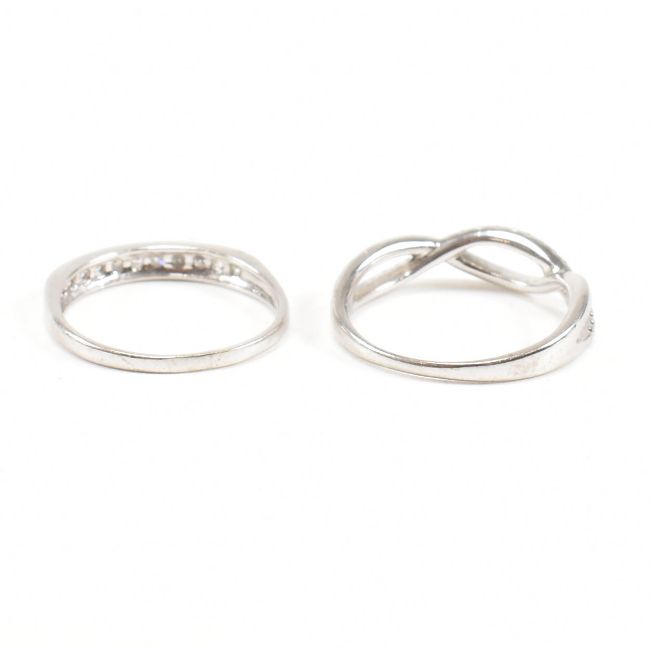 Two hallmarked 9ct white gold and diamond rings. A half eternity ring and diamond set swirl ring. Weight 4.4g. Sizes O.5 & P. All weights, measurements and sizes are approximate