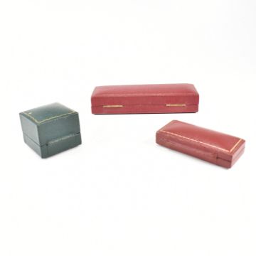 A collection of three Garrard and Co Regents Street London jewellery boxes . The boxes to include green and red tooled cases with lined interiors. Measures 14.5cm, 8.5cm, 4.8cm. All weights, measurements and sizes are approximate.